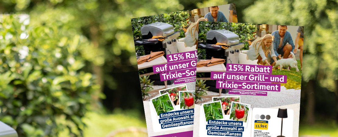 Starte optimal in die Grillsaison. Du erhältst 15 % Rabatt auf das gesamte Grill-Sortiment – vom klassischen Holzkohlegrill bis hin zu praktischem Zubehör. Auch Tierfreunde profitieren: Auf das komplette Trixie-Sortiment bekommst Du ebenfalls 15 % Rabatt.